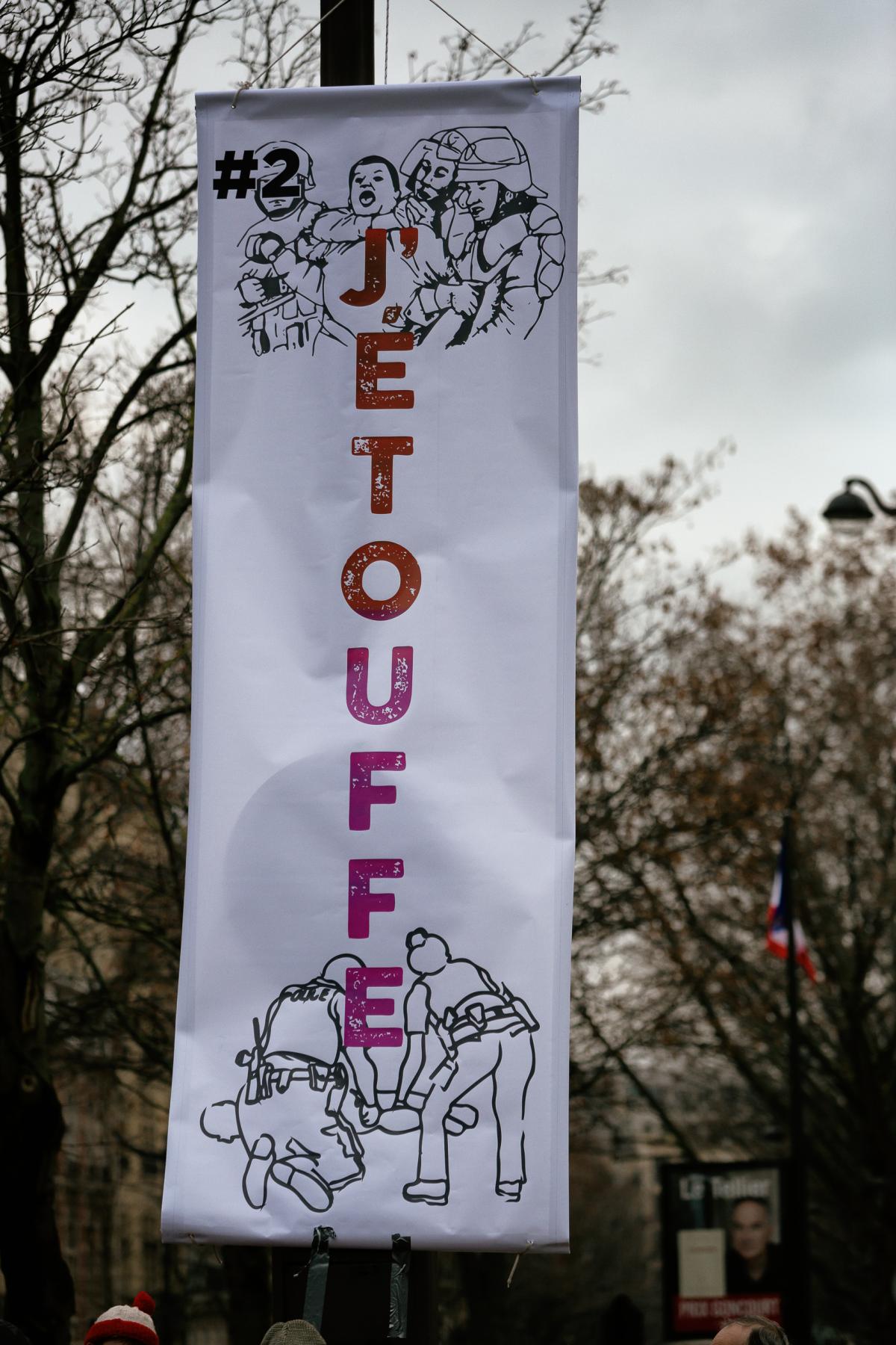 Banderolle du collectif Attac, avec le mot d ordre J etouffe, manifestation demandant justice pour Cedric Chouviat, Paris, 3 janvier 2021. Photographie de Martin Noda / Hans Lucas