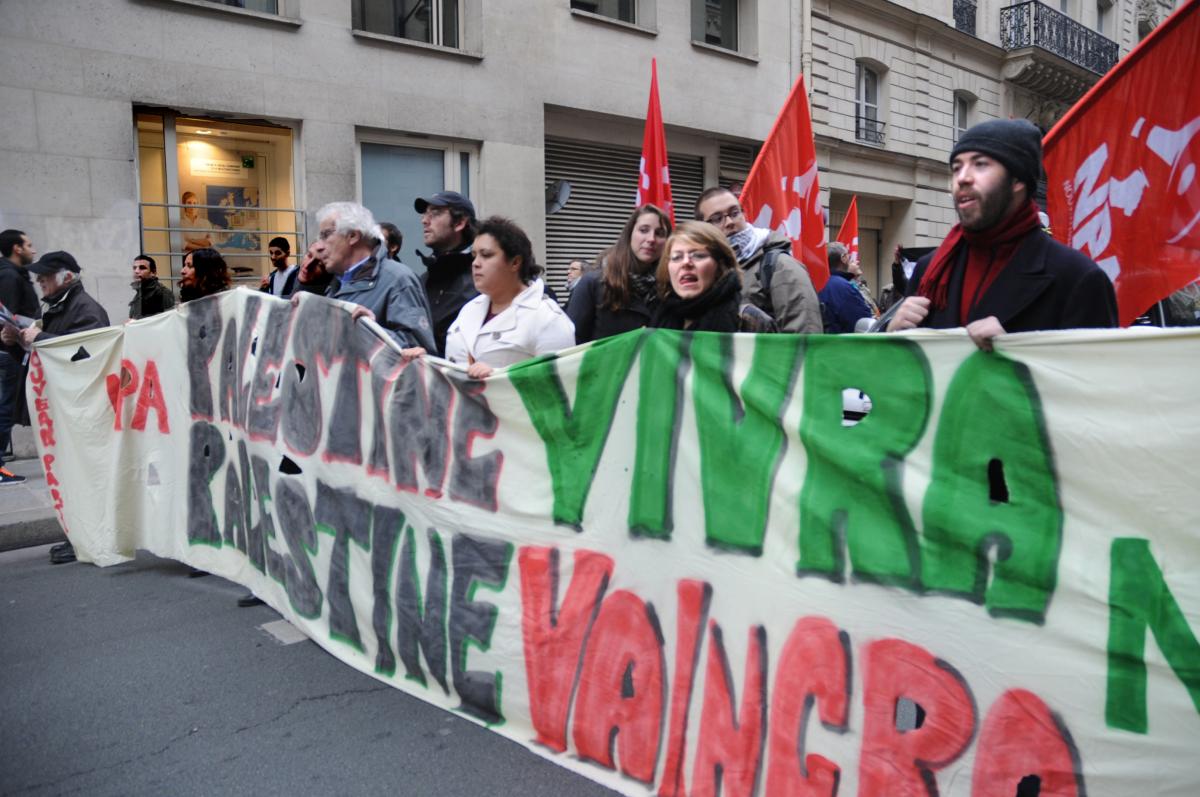 Alain Krivine banderole Npa Palestine vivra Palestine vaincra