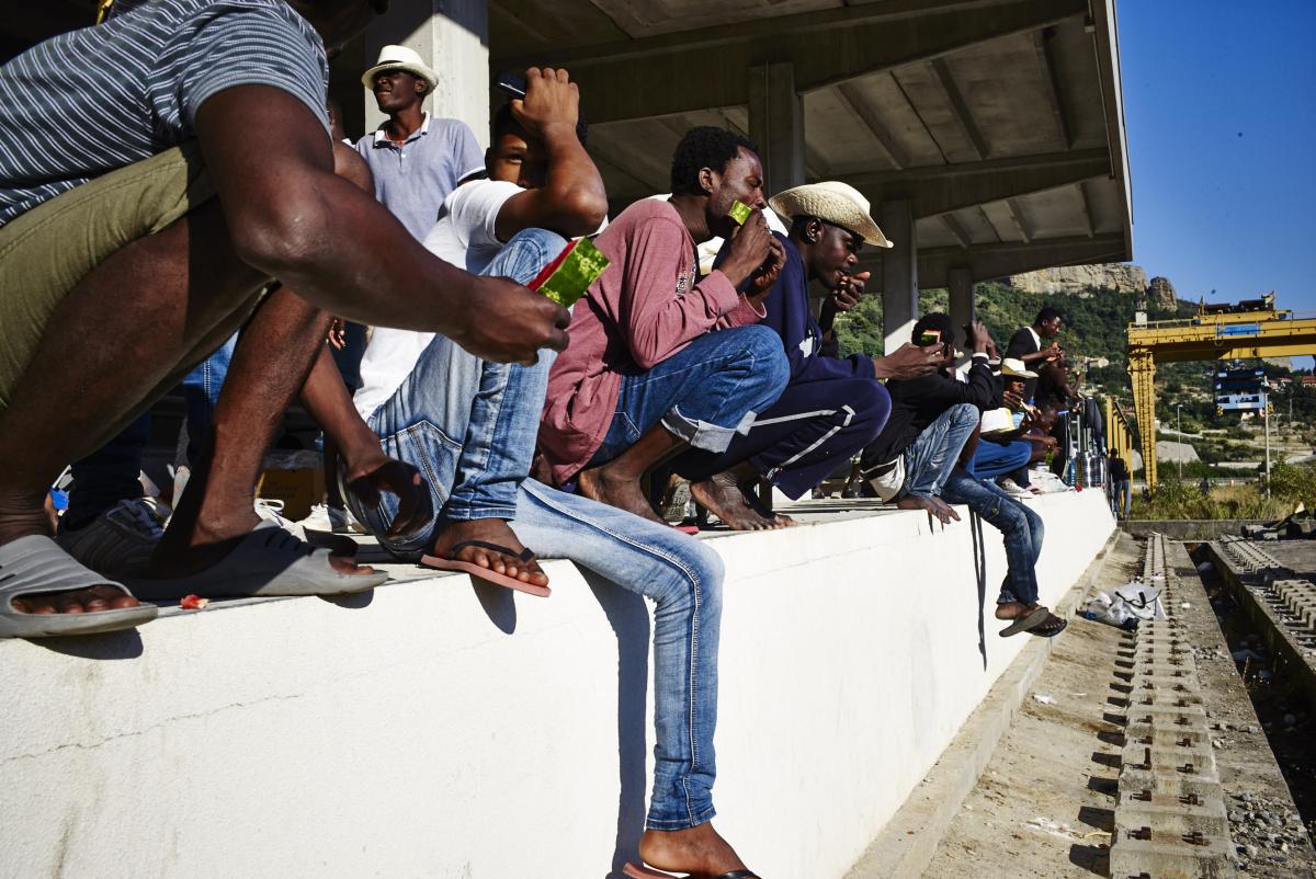 Les migrants mangent assis sur les quais.
