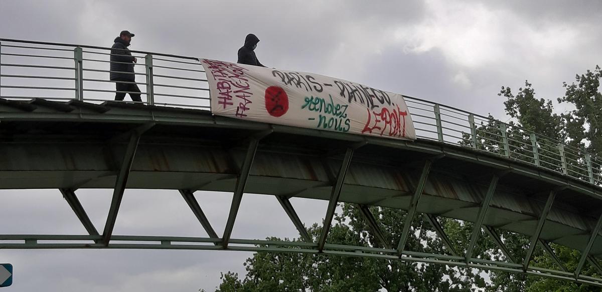 Banderole sur le canal de Saint-Denis Rendez nous le pont !
