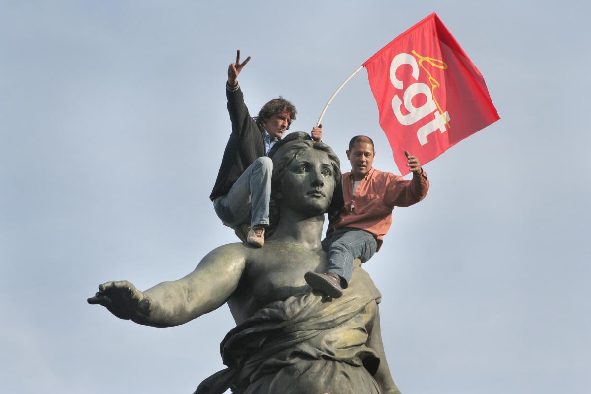 Le 18 octobre 2007 journée exceptionnelle de grève dans la fonction publique particulièrement dans les transports. L'après midi manifestation à 14h30 à Paris de la république à la Nation. La statue place de la Nation envahie par les manifestants. PARIS/2007/10/18/JMB