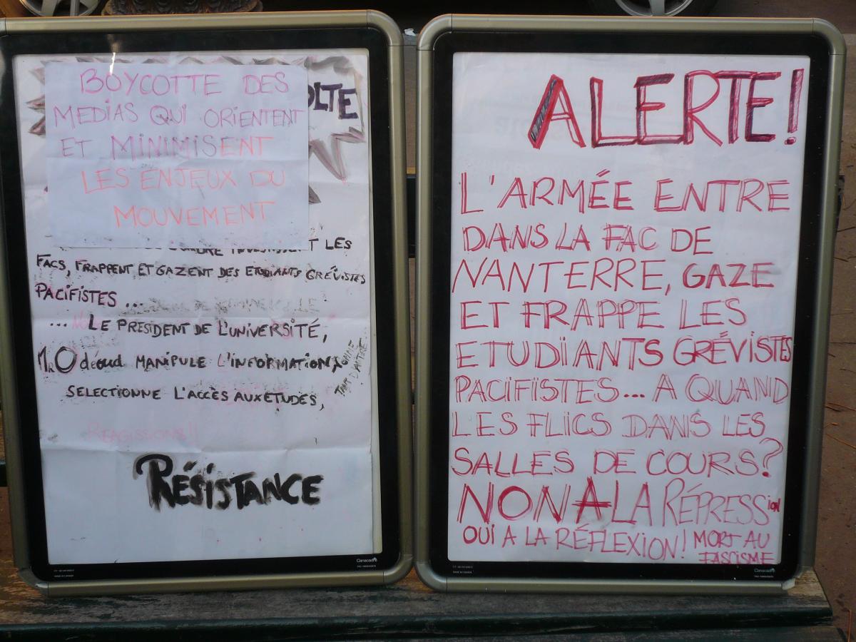 Panneau contre la loi Pécresse. Rassemblement étudiants et personnels universitaires devant l'assemblée nationale (500 personnes environ).