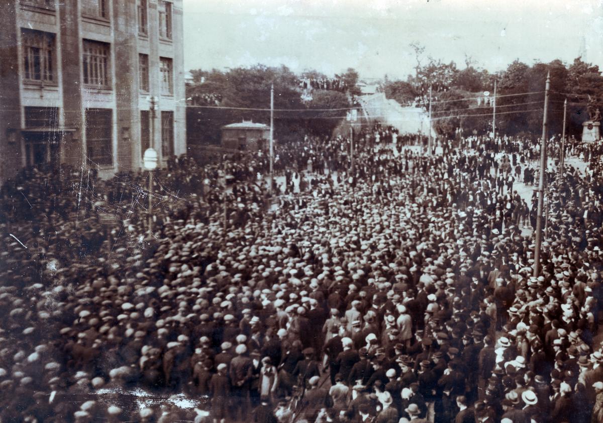 Une manifestation importante a eu lieu à Brest. Voici les ouvrier de l'arsenal et des fonctionnaires, au total 8 000 manifestants, parcourant les rues de Brest.