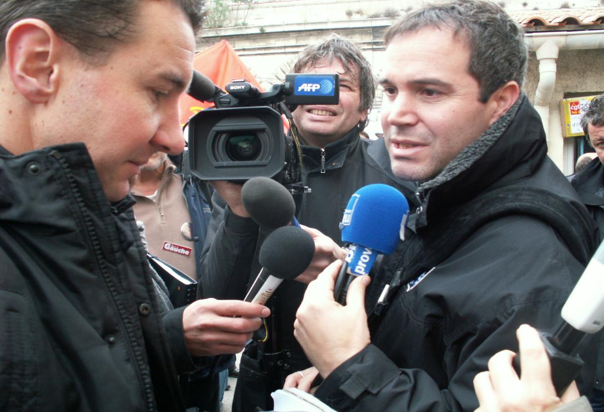 Marseille le 21/12/2010 : Visite de soutien dOLIVIER BESANCENOT aux postiers Du 2 éme arrondissement de Marseille en grève depuis plus de deux mois. contre le remplacement des facteurs de métier par des intérimaires