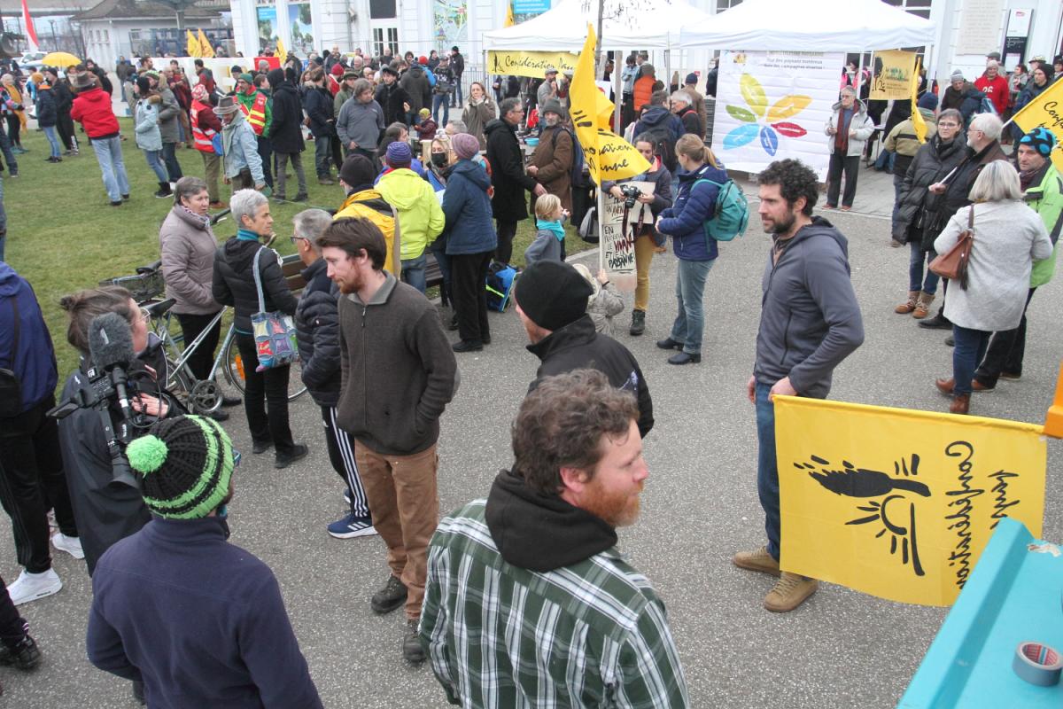 Des agriculteurs et des agricultrices se sont rassembléEs sur la place de la gare à Sélestat pour revendiquer de pouvoir vivre dignement de leur travail, en pratiquant une agriculture paysanne dont le but est de nourrir l'humanité.