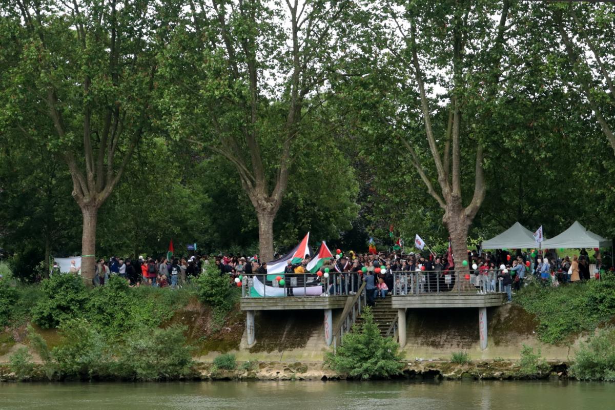 De Nanterre à Ivry-Sur-Seine une péniche, au couleur de la Palestine, remonte la Seine ce dimanche 2 juin 2024 pour dénoncer les massacres perpétrés par Israël dans la bande de Gaza. Elle fait escale à l'Ile Saint-Denis, où un rassemblement de plusieurs centaines de personnes attendaient son passage, après avoir manifesté pour rejoindre le lieu.