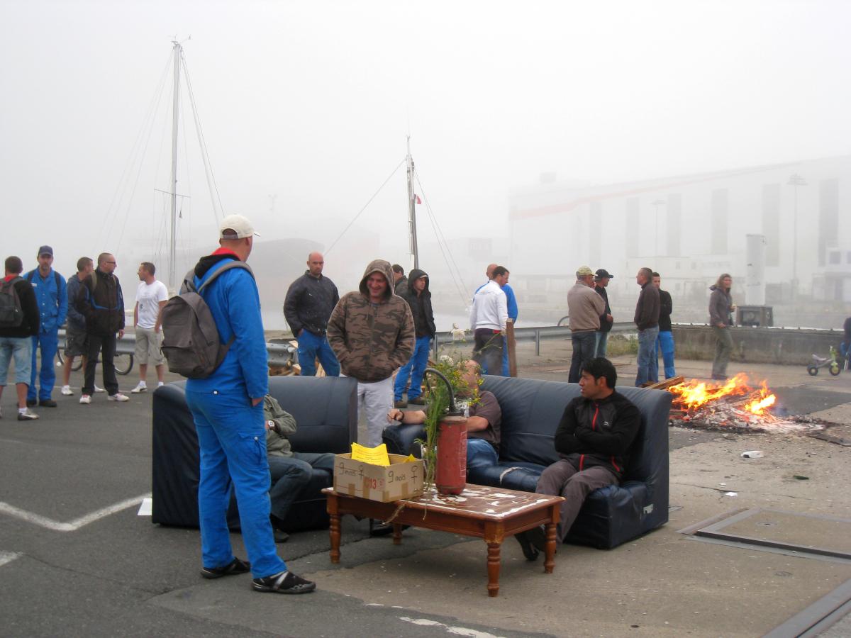 Barrage de grèvistes à l'écluse de la forme Joubert STX -Europe chantier de latlantique St Nazaire