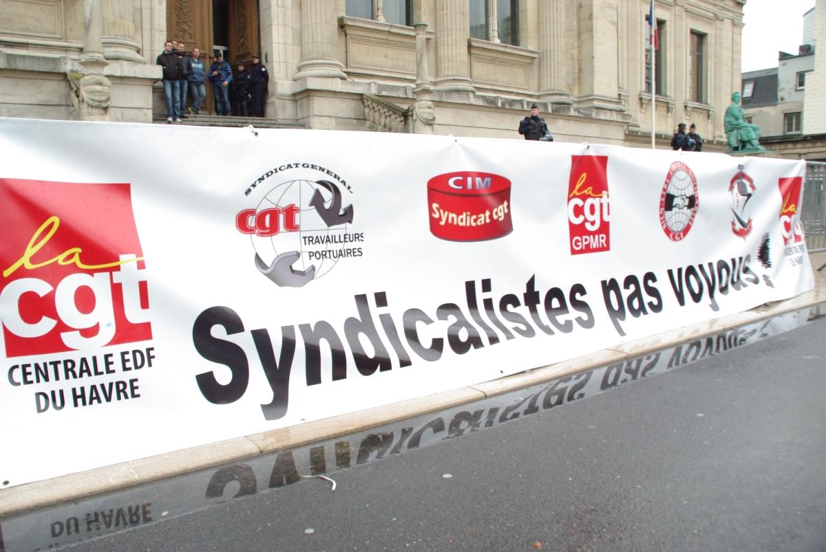 banderole syndicalistes pas voyous devant le TGI du Havre