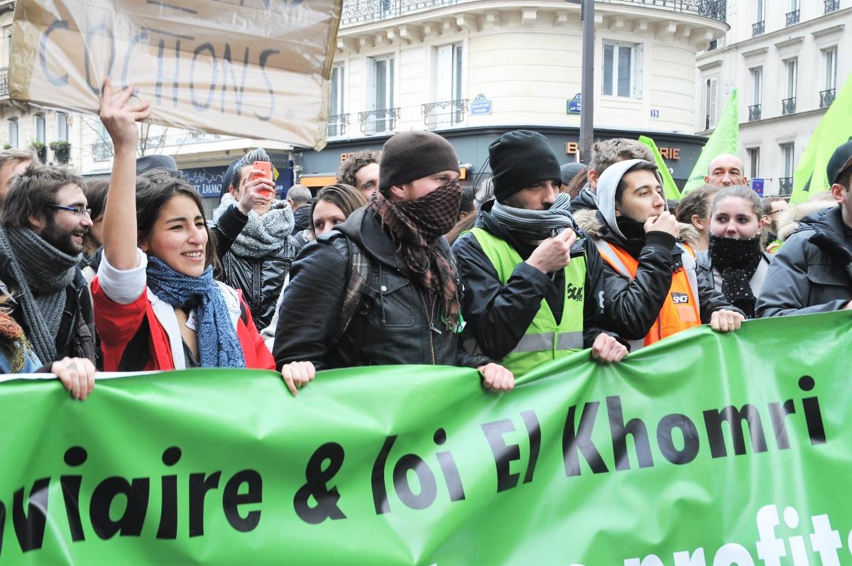 Manifestants Syndicat SUD Rail Cheminots contre le projet de loi El'Khomri de réforme du code du travail Paris 09 mars 2016