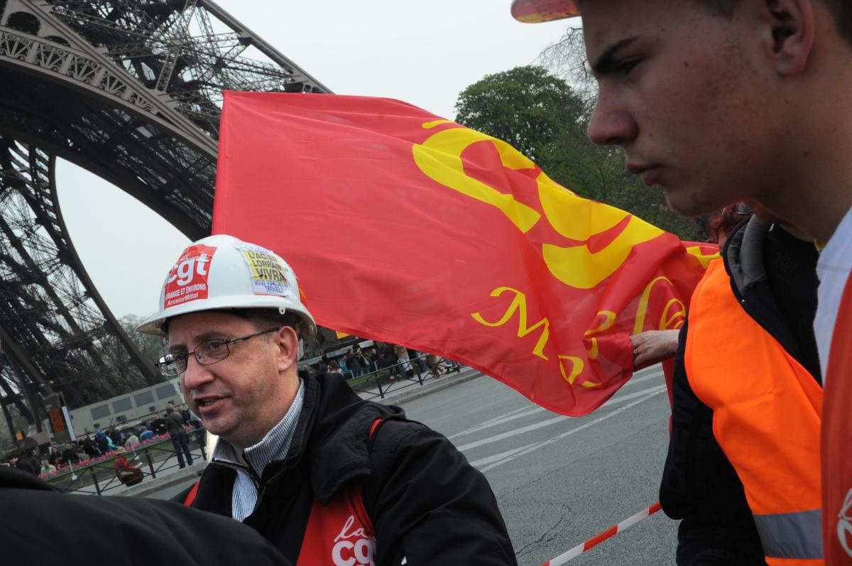 Les sidérurgistes d'Arcélor Mittal marchent de Florange à Paris pour la défense de l'acier lorrain, pour la remise en route des haut-fourneaux et le maintien des emplois. Il arrivent sous la Tour Eiffel le 6 avril 2012.