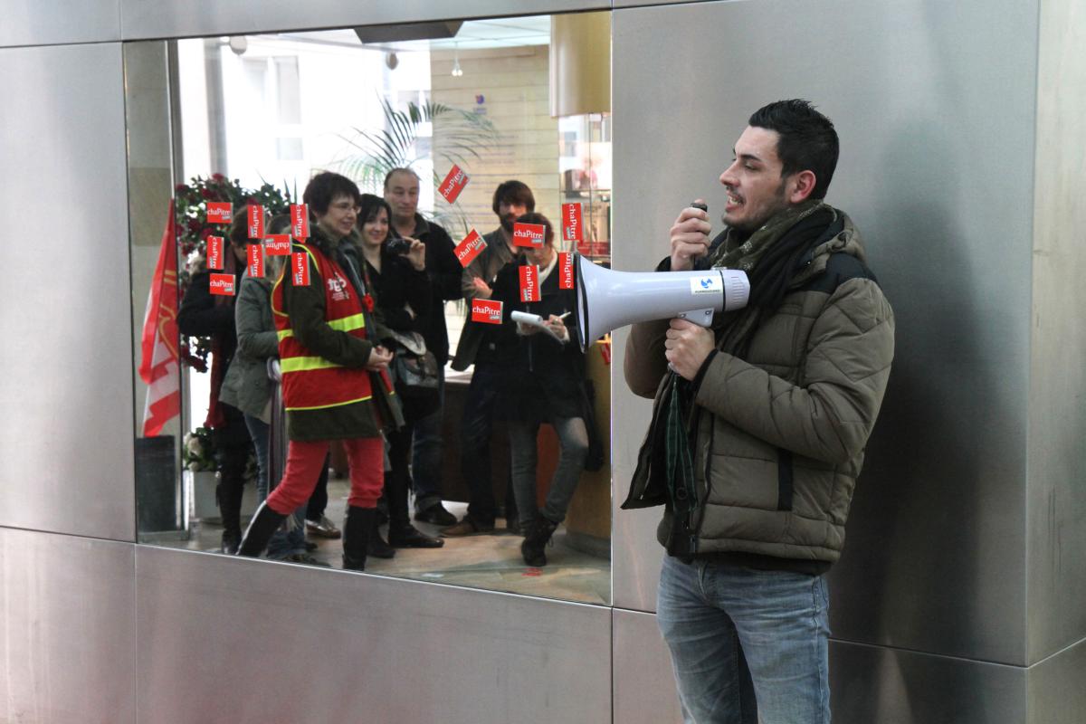Paris, le 24 février 2014, montée nationale des salariés des librairies Chapitre au siège de la société qui appartient au groupe France Loisirs. 434 emplois vont être supprimés. Philippe Poutou est venu les soutenir dans leur mobilisation