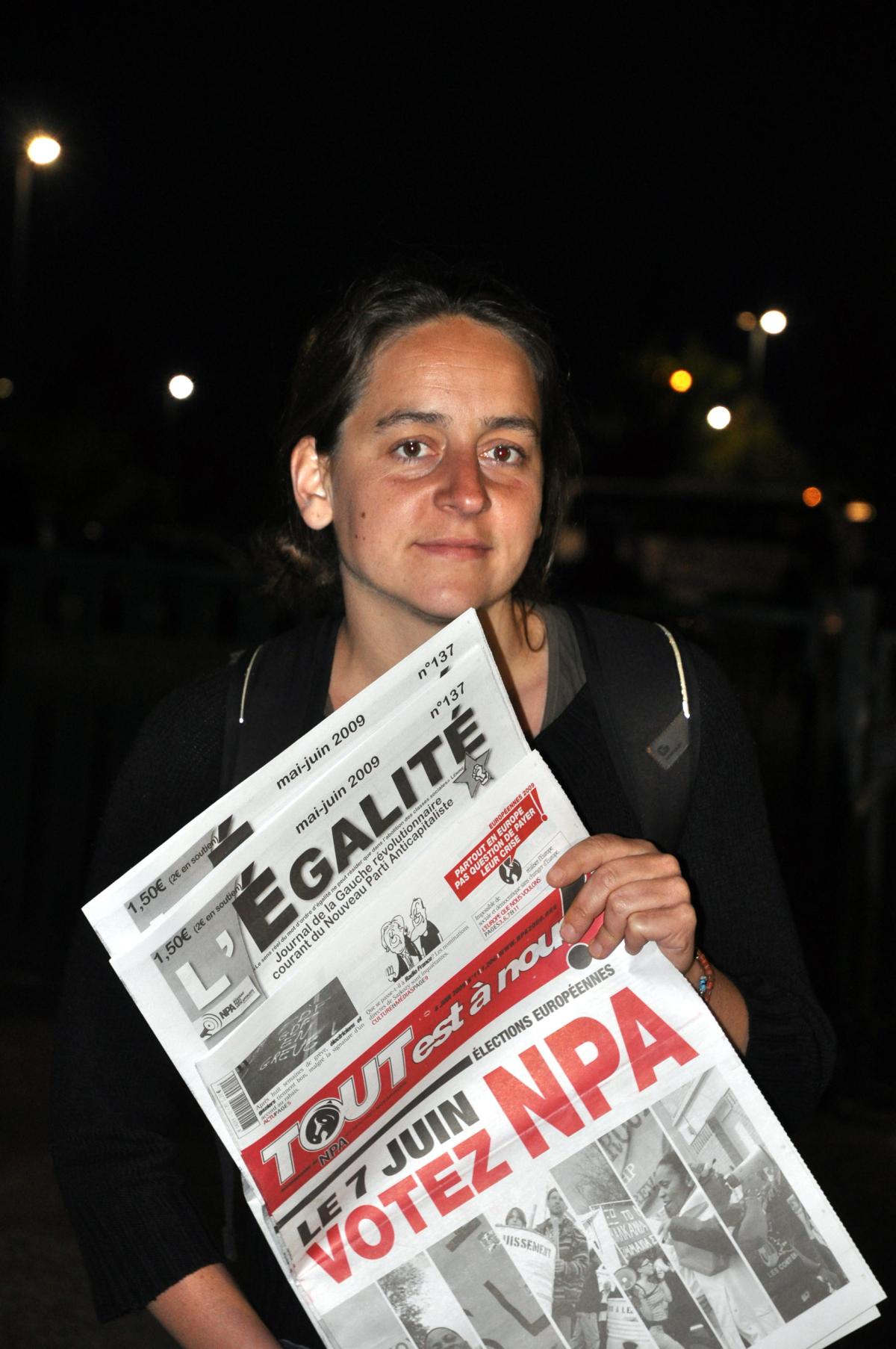 Rouen le 03 juin 2009. 750 personnes ont participé au meeting régionnal des élections européennes avec Olivier Besancenot. Militante vendant