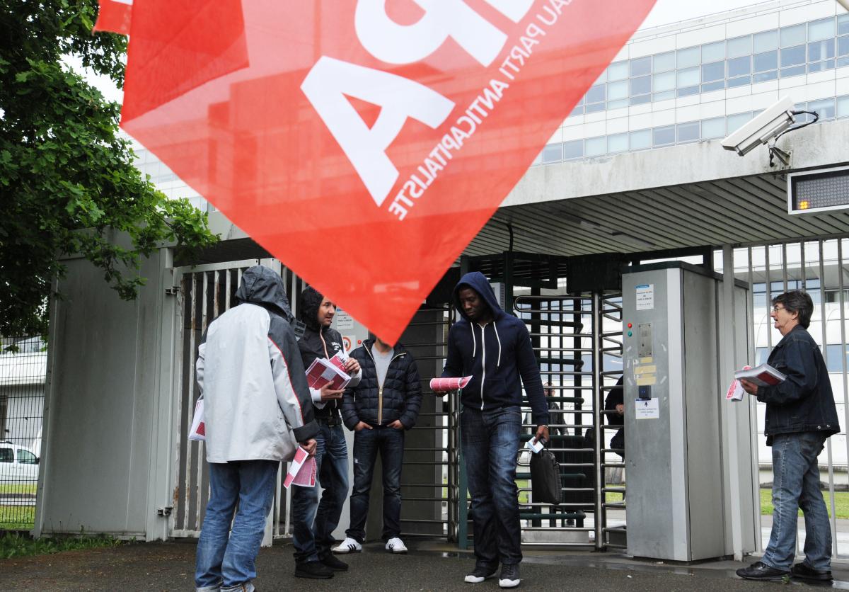Journée de campagne Européennes dans les Yvelines. Olivier Besancenot devant PSA Poissy, au service psychiatrique de l'Hôpital de Poissy-St.Germain, au Technocentre Renault de Guyancourt, et enfin au dépot de bus Phébus bloqué par les salariés. 20 Mai 2014