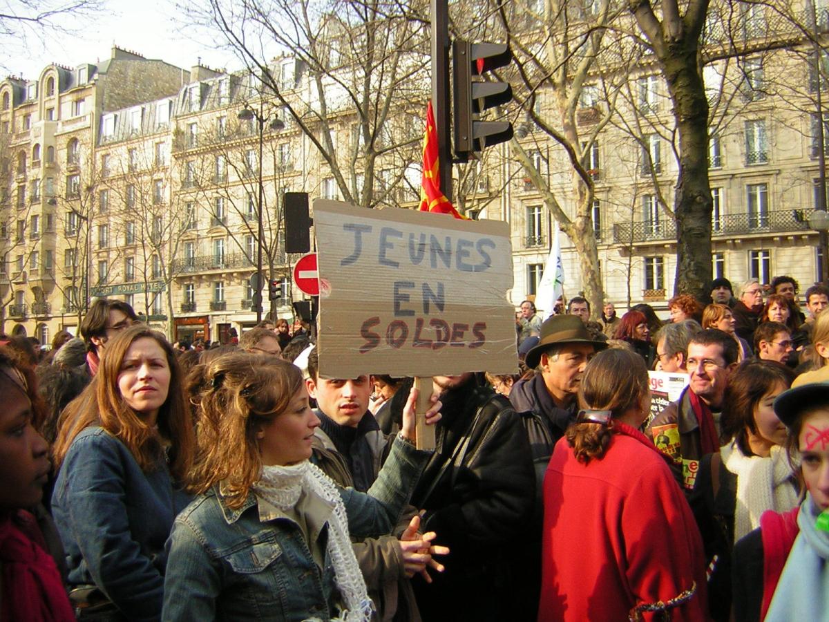 Manifestation parisienne de 350000 personnes (1,5 million en France) contre le contrat première embauche (CPE, instaurant une période d'essai de deux ans) voulu par le Premier ministre Dominique de Villepin. Paris/18/03/2006/Léa Guichard.