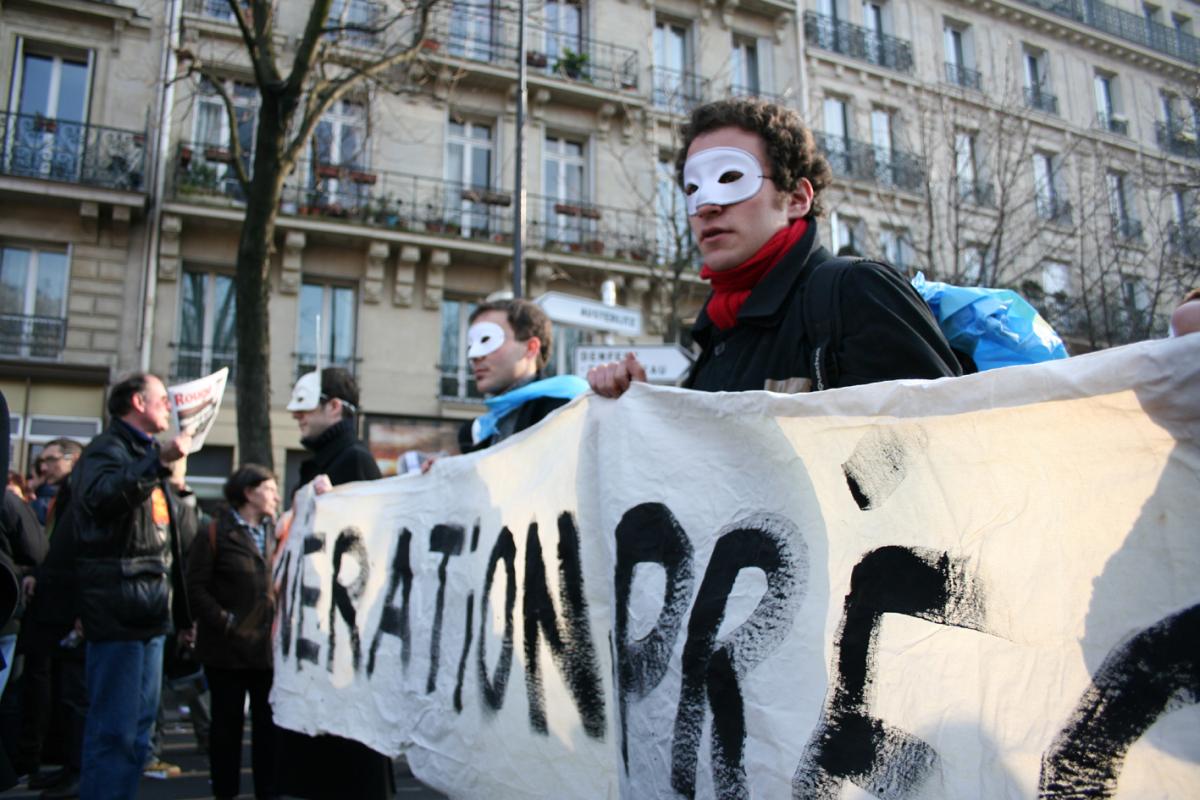 Manifestation parisienne de 350000 personnes (1,5 million en France) contre le contrat première embauche (CPE, instaurant une période d'essai de deux ans) voulu par le Premier ministre Dominique de Villepin. Banderole de Génération précaire. Paris/18/03/2006/@Sven_A.