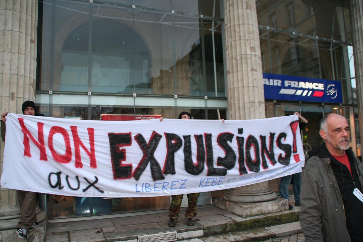 300 à 400 personnes à la manifestation en soutien à Kébé et tous les sans-papiers, samedi 1 décembre à Bordeaux du CRA, à la Préfecture en passant par l'Anaem et, ici devant Air France, pour dénoncer la politique d'immigration et d'expulsion. Bordeaux/2007/12/01/Meno