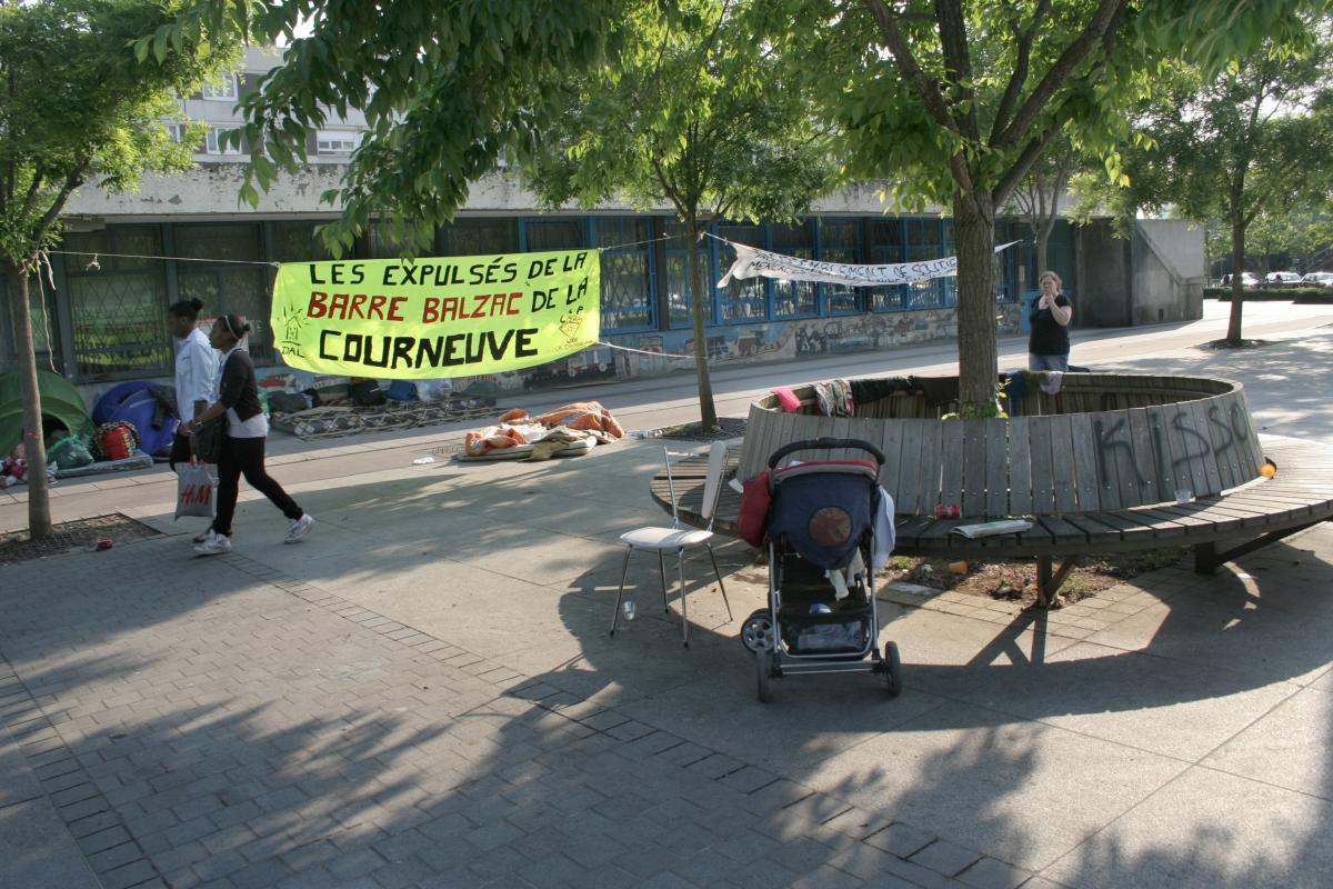Depuis le 18 avril 2011, les familles, expulsées de la barre Balzac à La Courneuve en juillet 2010, reprennent le campement sur la place de la Fraternité. Le préfet Lambert, de la Seine Saint Denis, a décidé brutalement de mettre fin aux hébergements en hôtel.