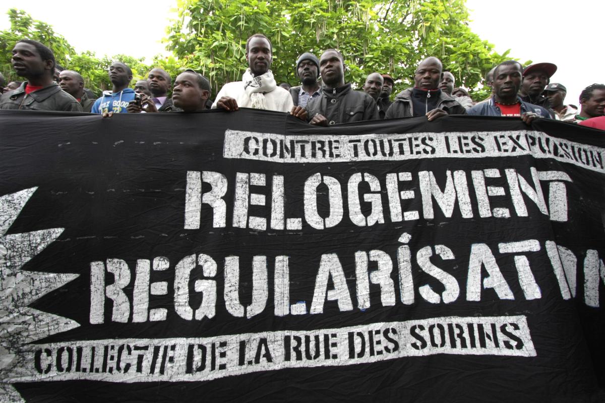 Rassemblement devant la préfecture de Bobigny le 12 octobre 2011 des mal-logés, expulsés de la Seine St Denis, pour exiger le relogement. Le préfet interdit les rassemblements sur le parvis de la préfecture et cantonne les manifestants dans un coin de la place.