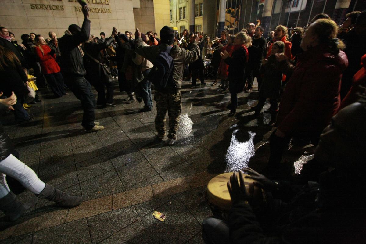 Saint-Denis le 21 décembre 2011, repas de noël des expulsés du logement, sur le parvis de la mairie. L'atelier de la Belle étoile anime la soirée.