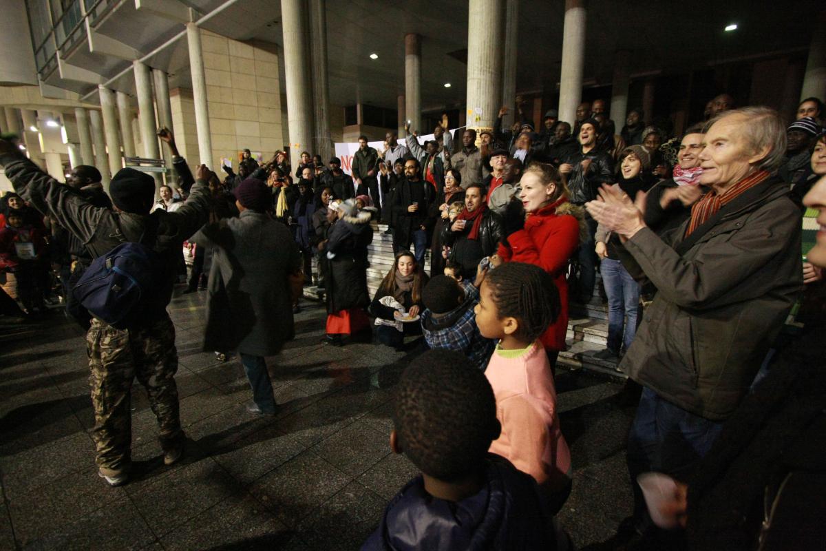 Saint-Denis le 21 décembre 2011, repas de noël des expulsés du logement, sur le parvis de la mairie. L'atelier de la Belle étoile anime la soirée.