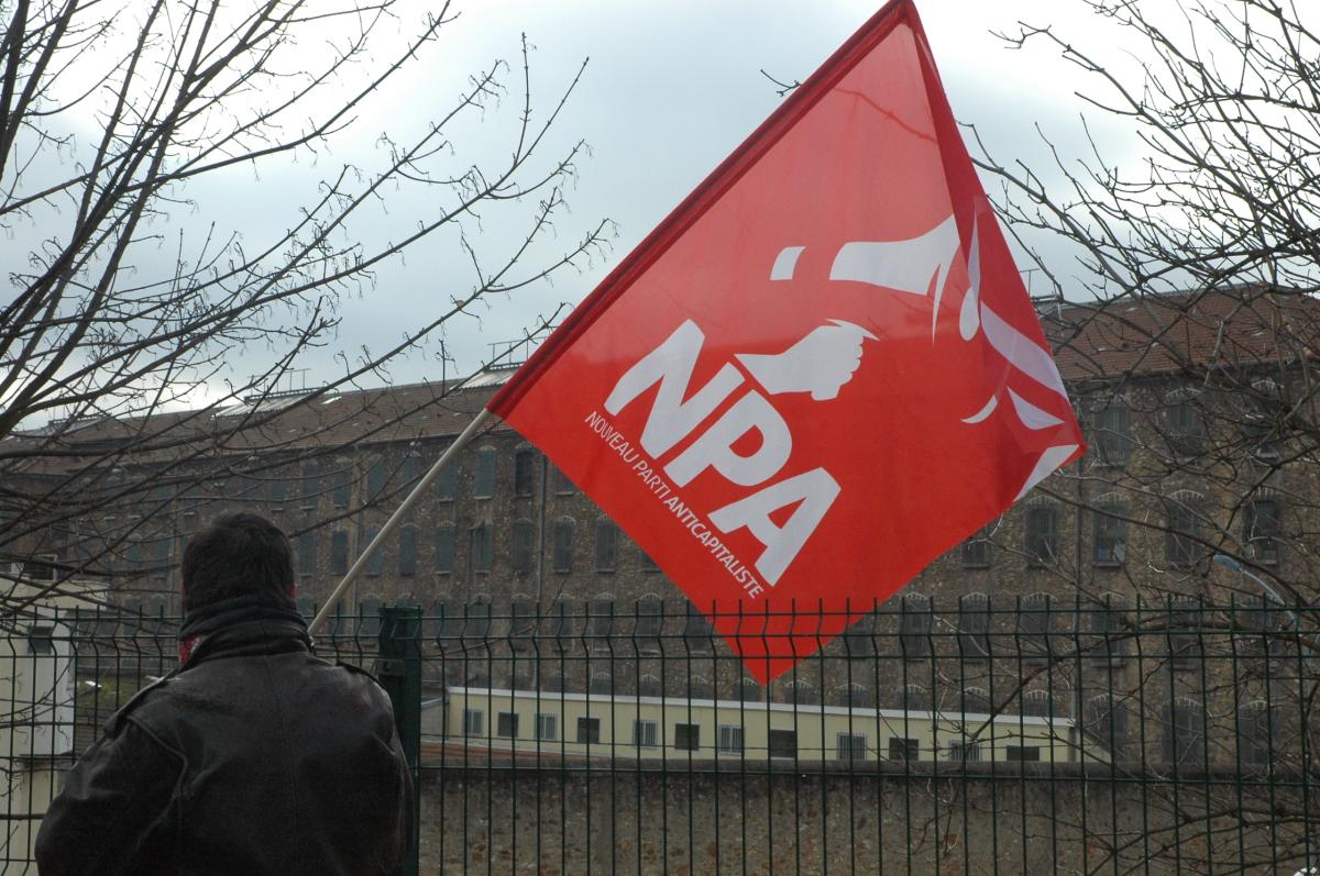 drapeau Npa devant la Prison de Fresnes ou se trouve Jean Marc ROUILLAN.