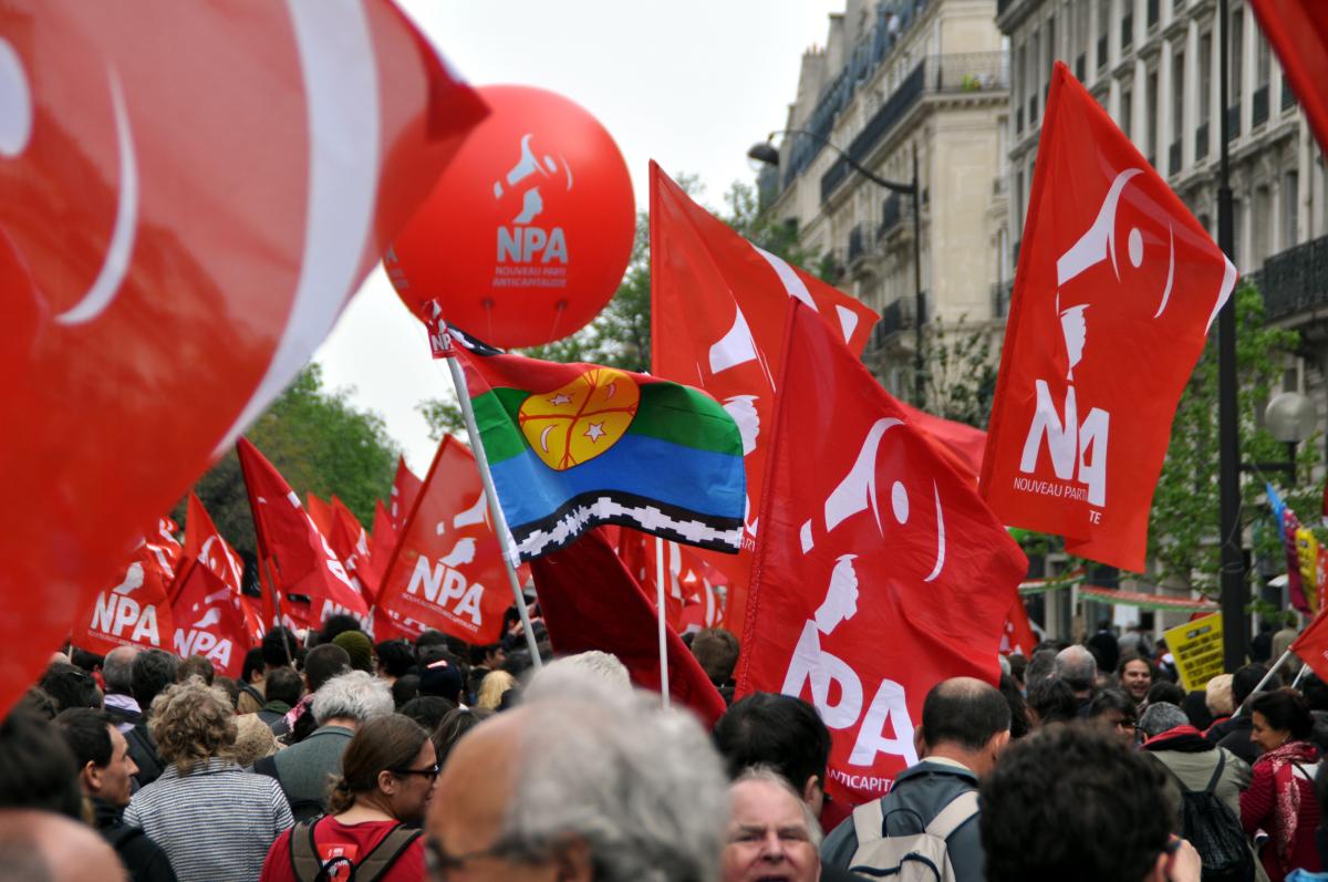 Paris, le 12 avril 2014. Manifestation Unitaire contre l'austérité. Drapeaux NPA.