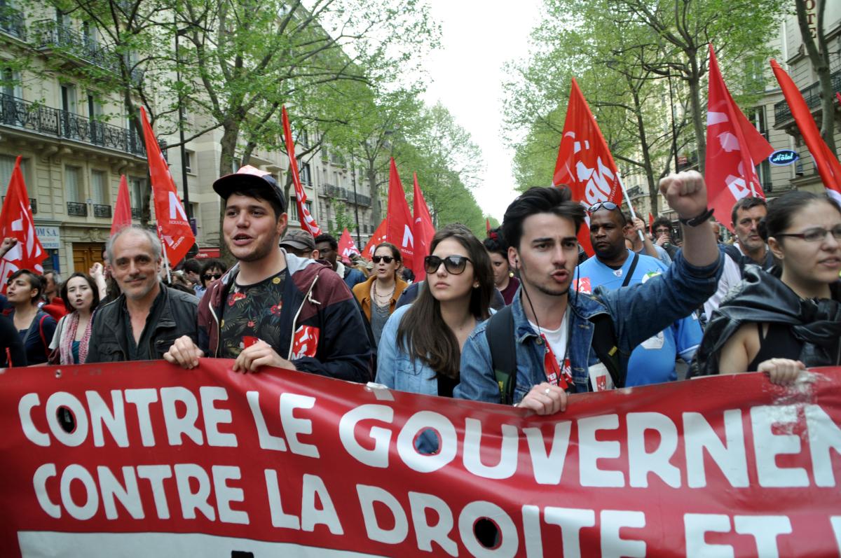 Paris, le 12 avril 2014. Manifestation Unitaire contre l'austérité. Tête du cortège NPA avec Philippe Poutou.