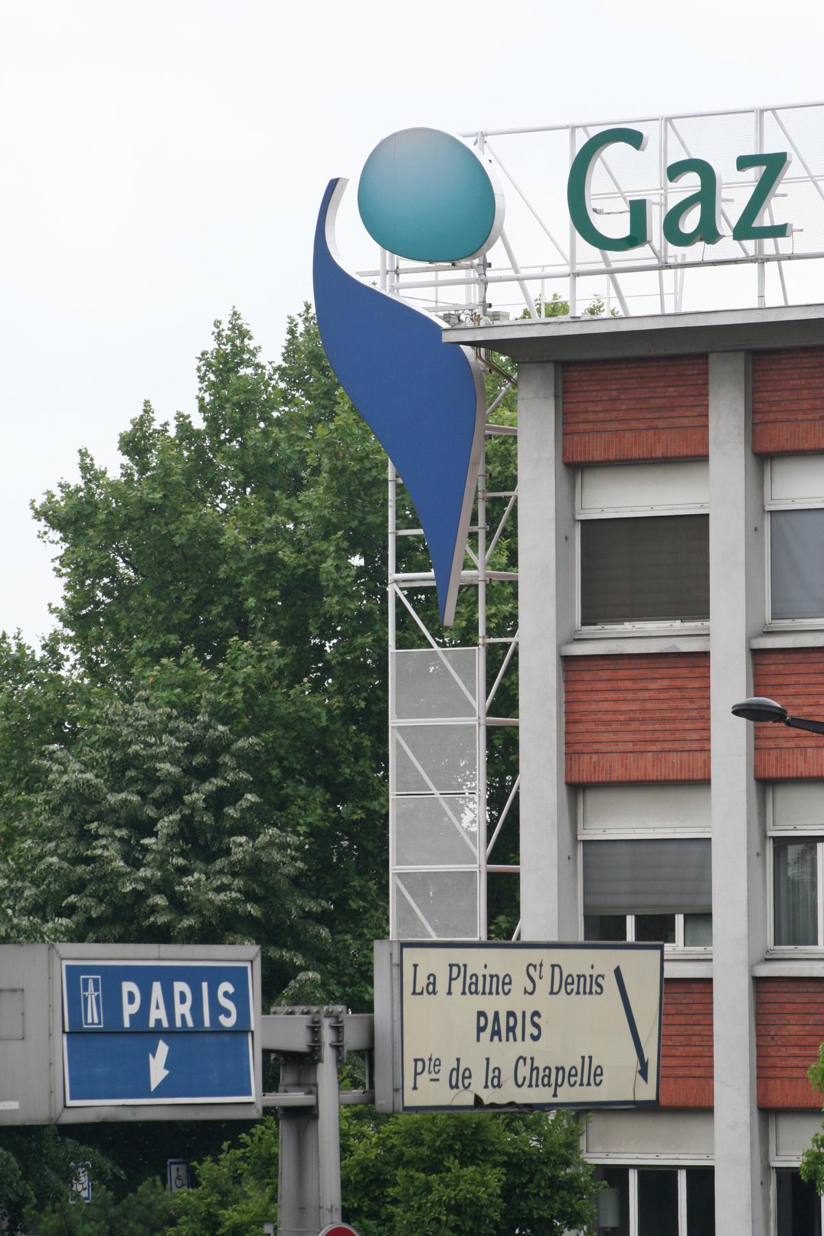 les logos du centre de recherche du gaz de france à saint denis vus du grand stade 20 juin 2006.