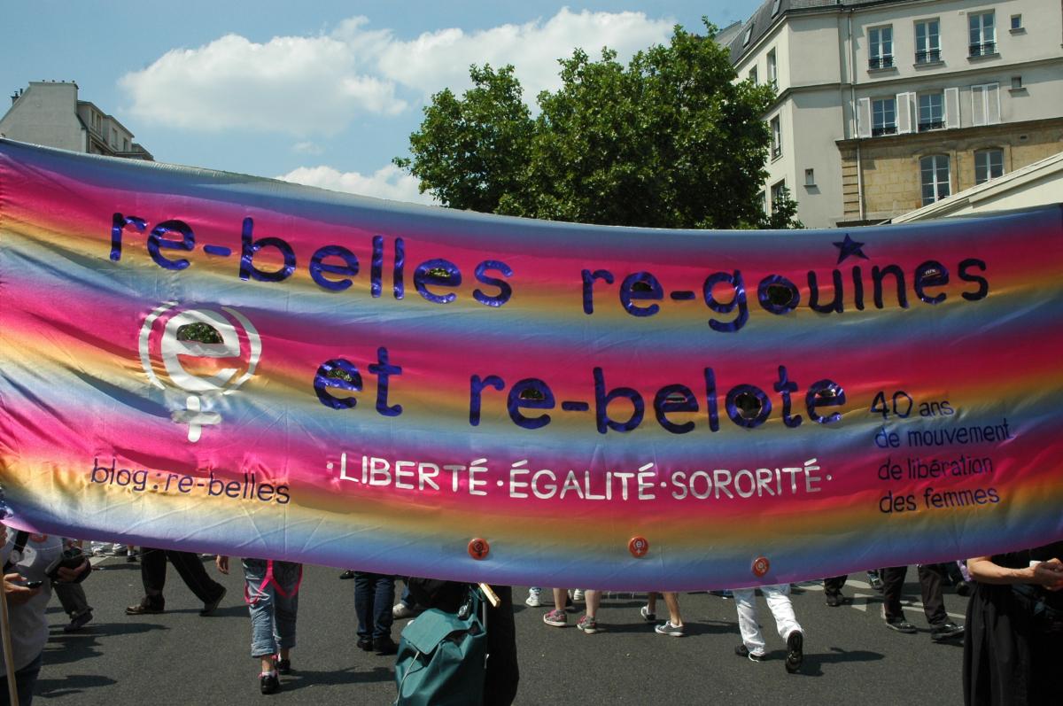 banderole re-belles,re-gouïnes et re-belote,Quarante ans de mouvement de libération des Femmes.Blog: re-belles.