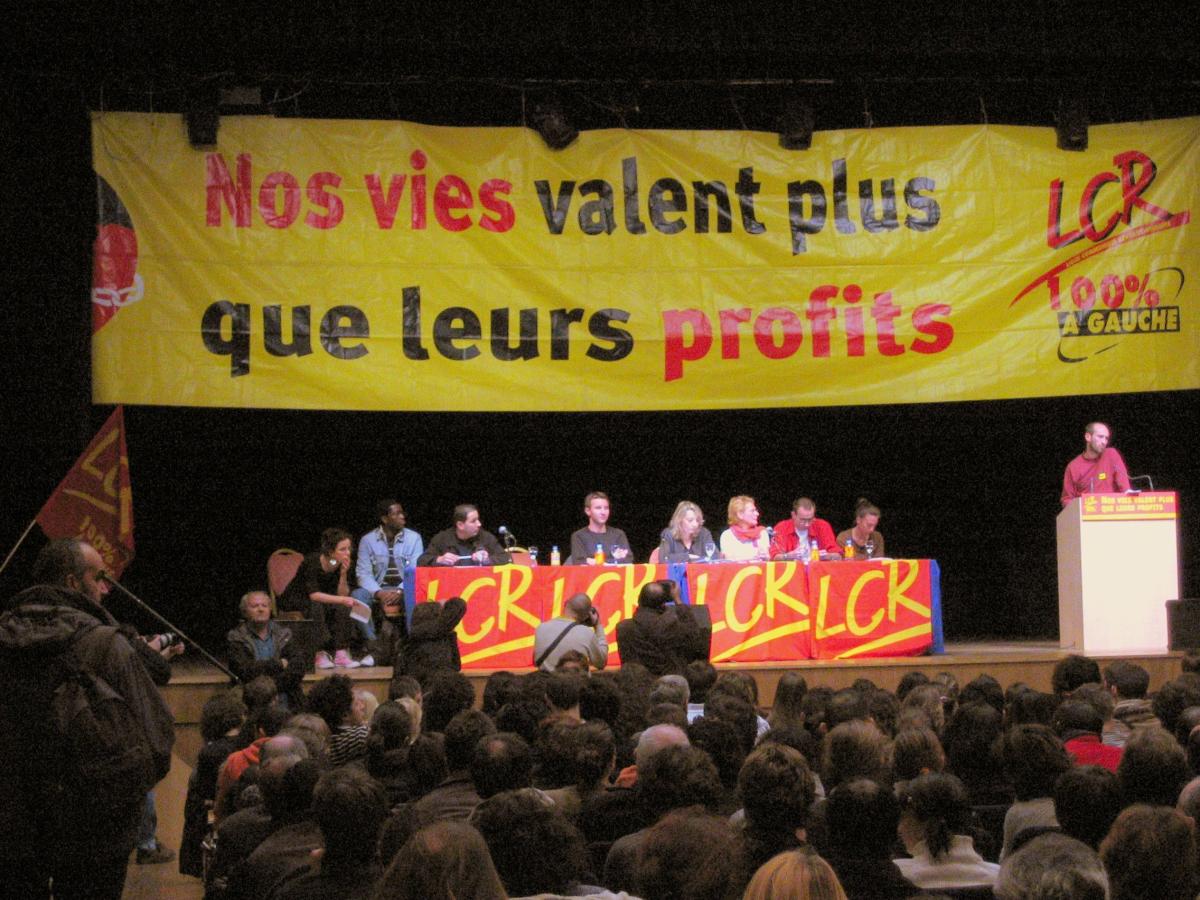 Meeting à la Mutualité de la LCR avec à la tribune, entre autres, Olivier Besancenot (porte-parole de la LCR), une militante des JCR), une militante du Collectif National Droit des Femmes, et des représentants de salariés en lutte des bagagistes de Roissy, des colis postaux, et des Reynolds. Paris/2006/11/30/CM.