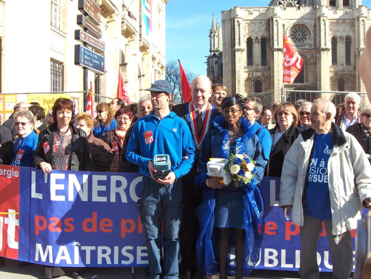 Mariage symbolique d'Edf et Gdf, à la mairie de Saint-Denis avec Didier Paillard, le maire de saint-Denis. Contre la privatisation des deux entreprises. Contre la fusion de Gdf avec Suez. - Saint-Denis 10/03/2007 ph:Babar
