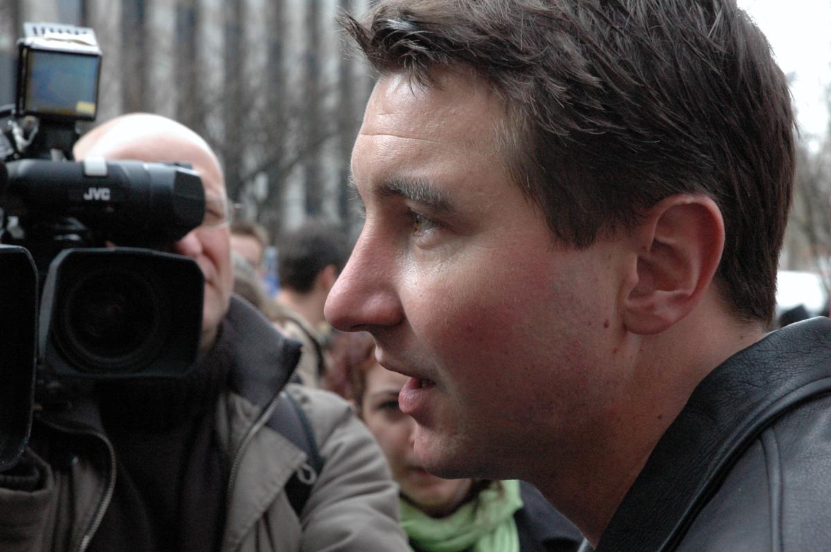 Olivier Besancenot devant une caméra