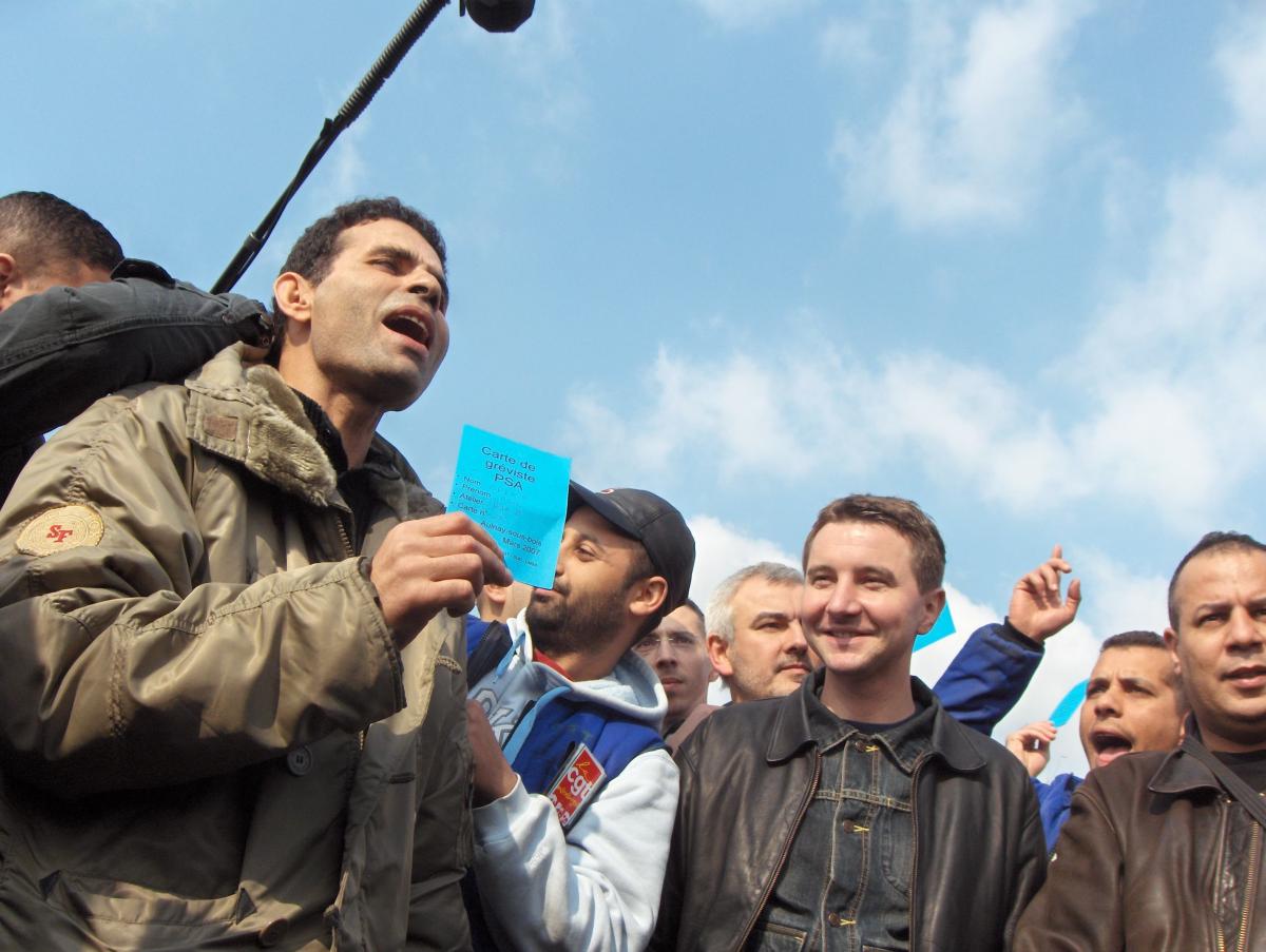 Olivier Besancenot présents à lusine Citroën dAulnay-sous-Bois boulevard André Citroën (93), jeudi 22 mars, pour apporter leur soutien total à la grève des ouvriers du site.