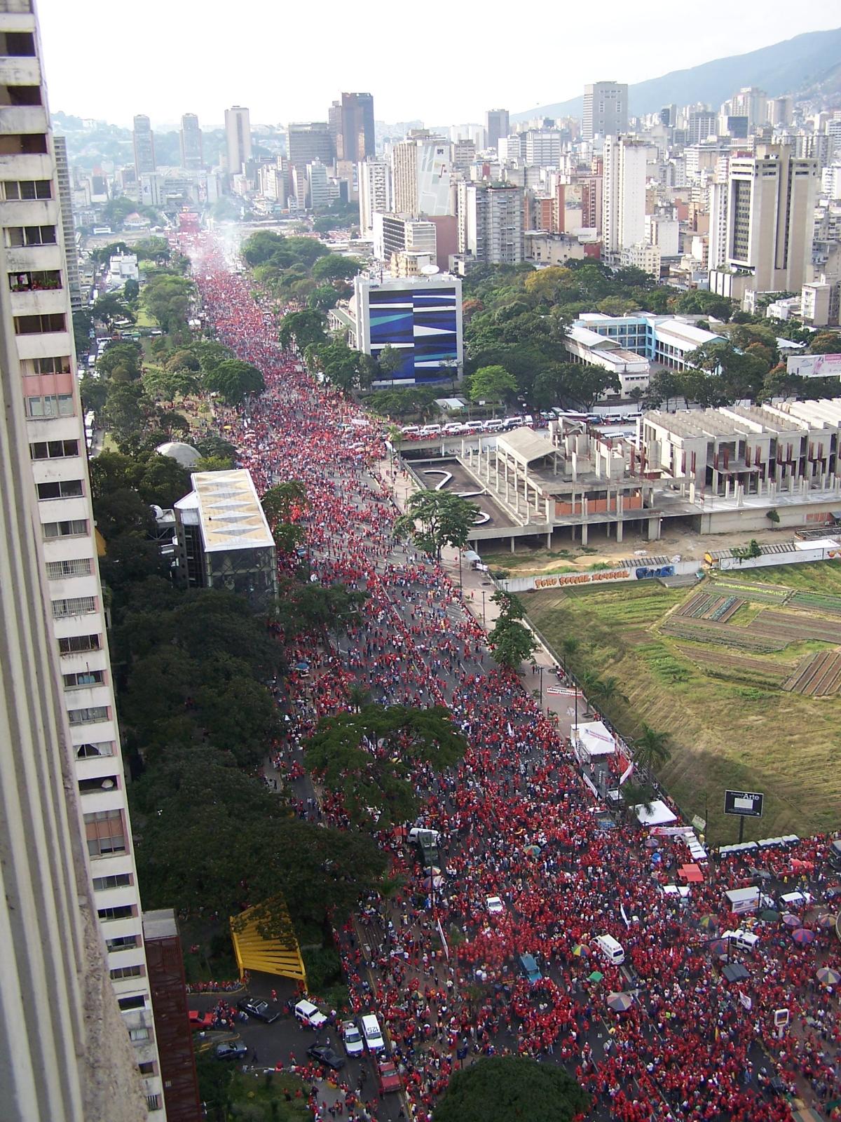 Manifestation en soutien à Hugo Chavez, lors de son passage sur l'avenida Bolivar. Au fond, l'estrade devant accueillir Hugo Chavez. La