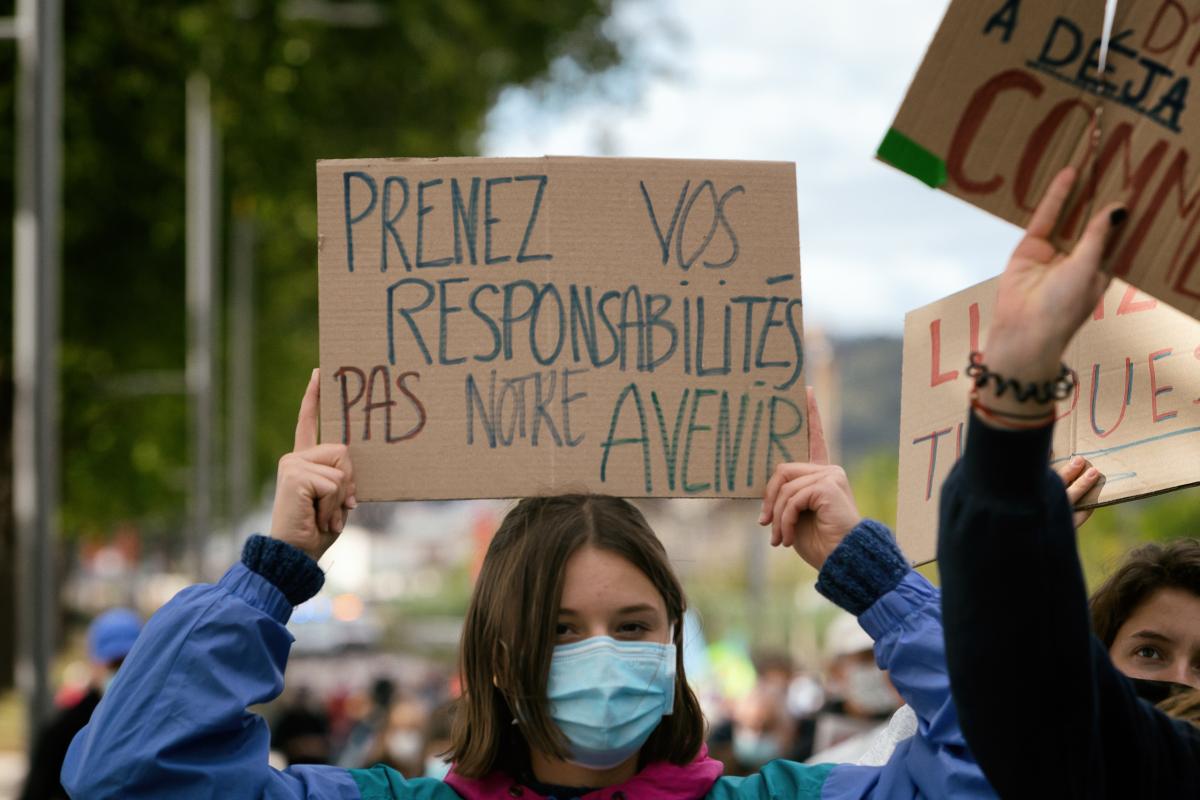 A young demonstrator with a sign for another future, demonstration after 1 year of Lubrizol fire, Rouen, September 26 2020. Photograph by Martin Noda / Hans Lucas
